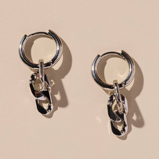Original price $34.00 - Original price $34.00Original price$34.00$34.00 - $34.00Current price $34.00| /These sterling silver plated huggie hoop earrings feature a hinged closure with a dangling brushed silver curb chain accent. Perfect to wear alone ...