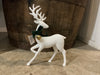 Wicker-style resin reindeer features velvet jingle bell bow at neck.