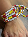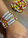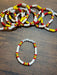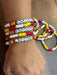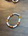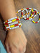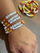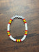 "CHIEFS" White Heishi Beaded Stretch Bracelet is made with white heishi beads and pops of red and yellow beads for a vintage football feel. CHIEFS is spelled in white acrylic letters. Made to 7.5 inches in length by hand in Lenexa, KS.